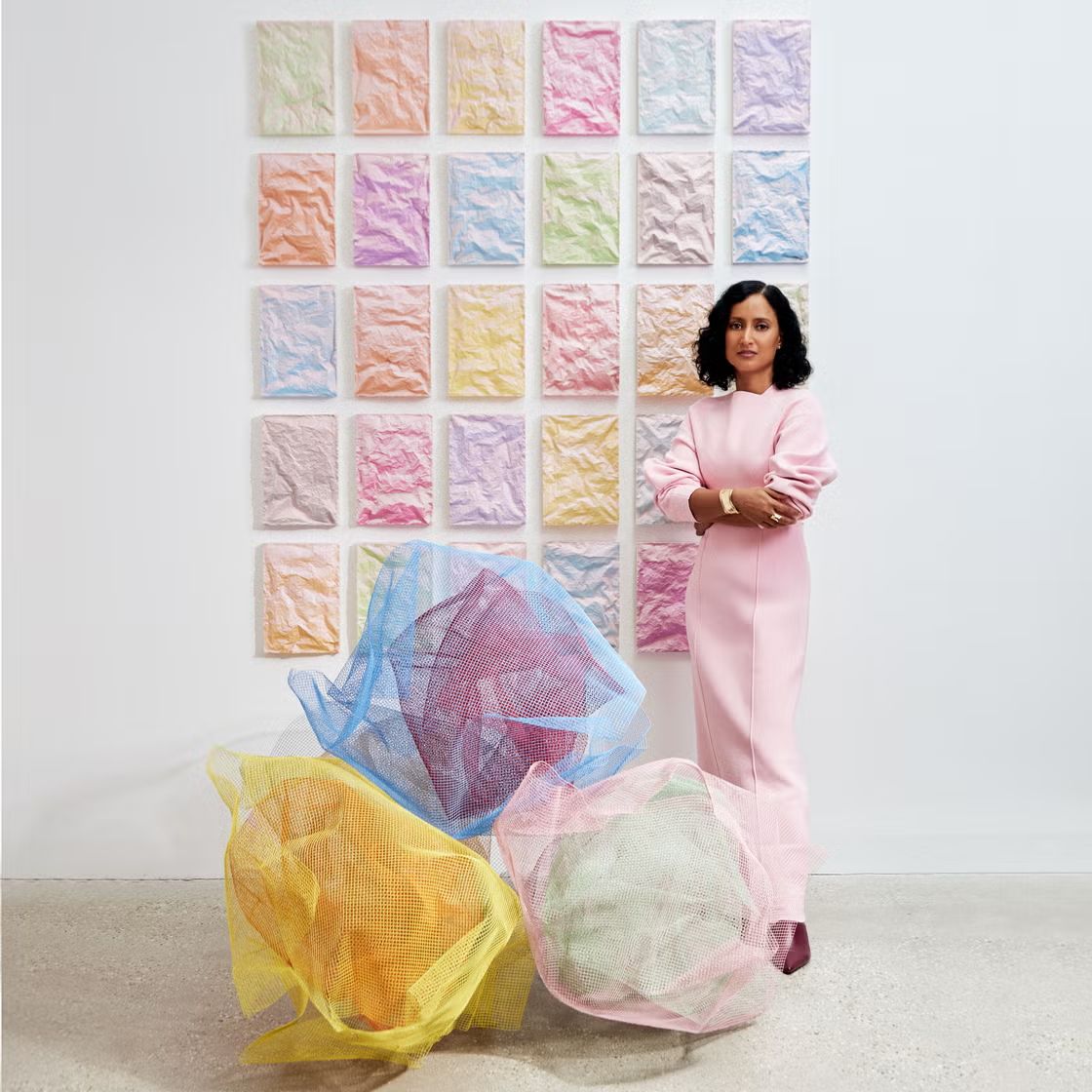 Rana Begum nasceu em Bangladesh e cresceu na Inglaterra sem sequer imaginar que poderia ser artista — foi desenhando com lápis de cor, ainda sem falar inglês, que encontrou sua primeira forma de pertencimento. Hoje, combina minimalismo americano com as geometrias e repetições da arquitetura islâmica para criar obras que parecem pinturas, mas são estruturas industriais de metal, malha e refletores. As cores mudam conforme o espectador se move, cinéticas sem se mover, criando misturas ópticas que acontecem literalmente nos olhos de quem vê. Dos museus à Bienal de Gwangju, sua trajetória atravessa continentes, mas mantém a mesma obsessão: transformar luz, espaço e repetição em experiência sensorial.